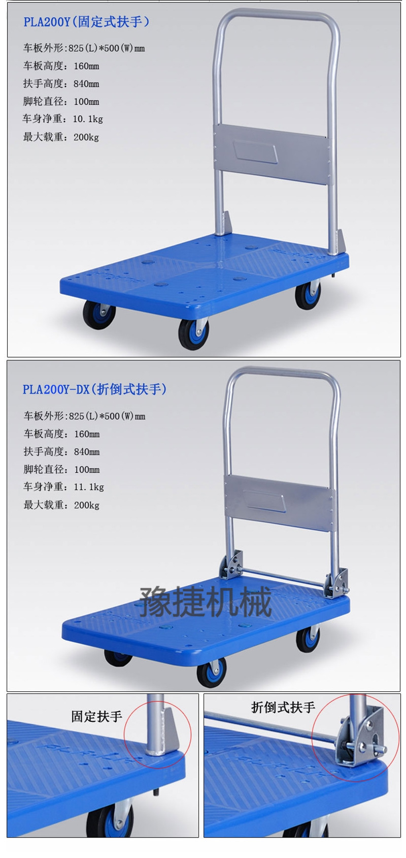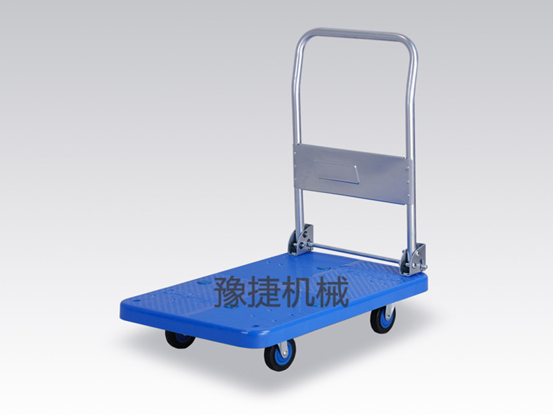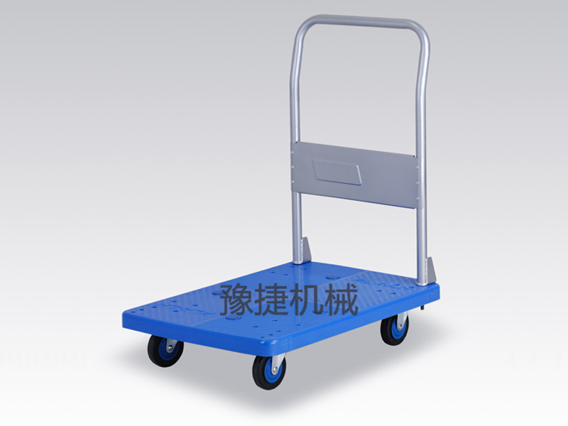 【豫捷】平板手推车由塑料车板、粉体涂装扶手(可折倒、固定)、静脚轮(尼龙支架、铁板支架)等组成。