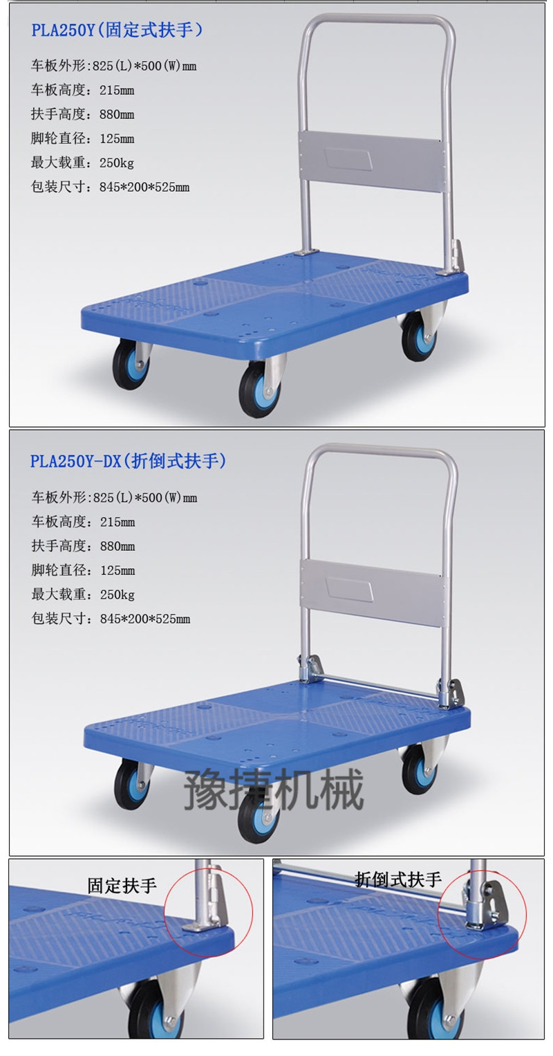 【豫捷】平板手推车由塑料车板、粉体涂装扶手(可折倒、固定)、静脚轮(尼龙支架、铁板支架)等组成。