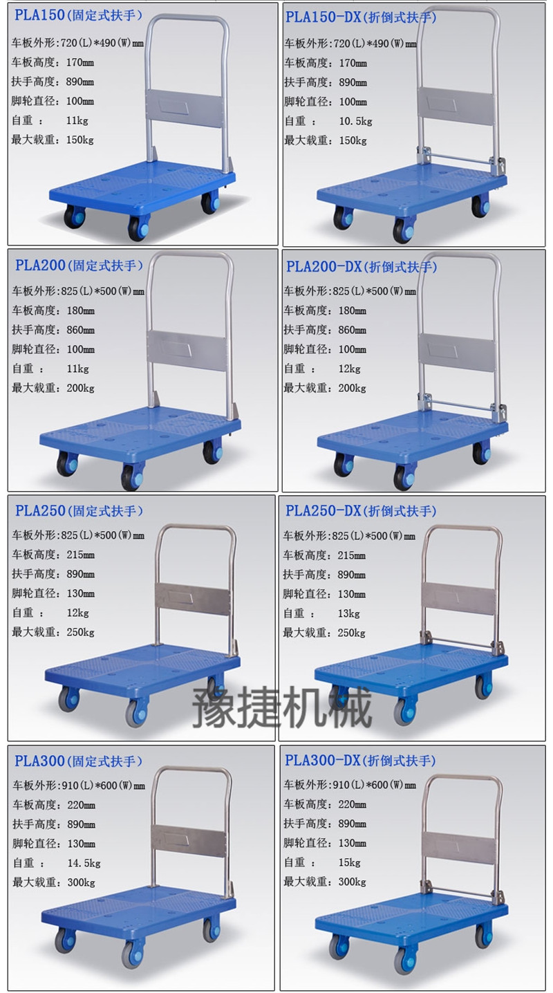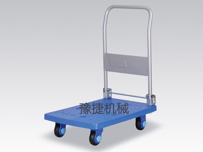 【豫捷】平板手推车由塑料车板、粉体涂装扶手(可折倒、固定)、静脚轮(尼龙支架、铁板支架)等组成。