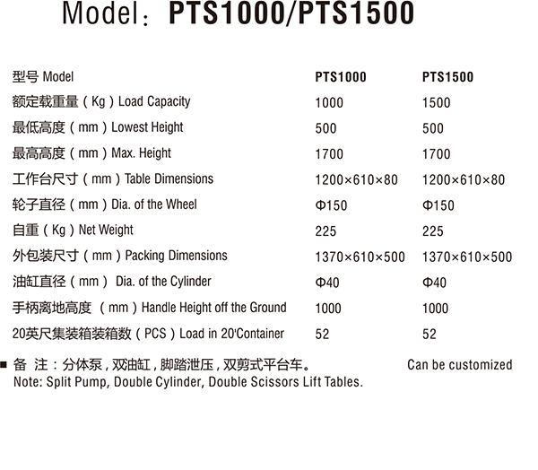 备注:分体泵,双油缸,脚踏泄压,双剪式平台车 | ||